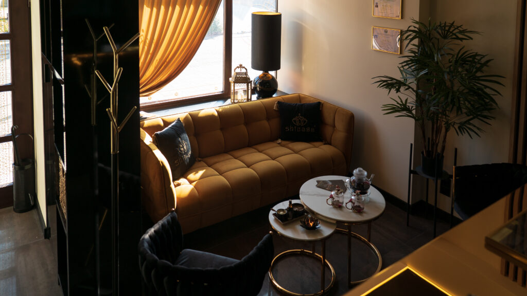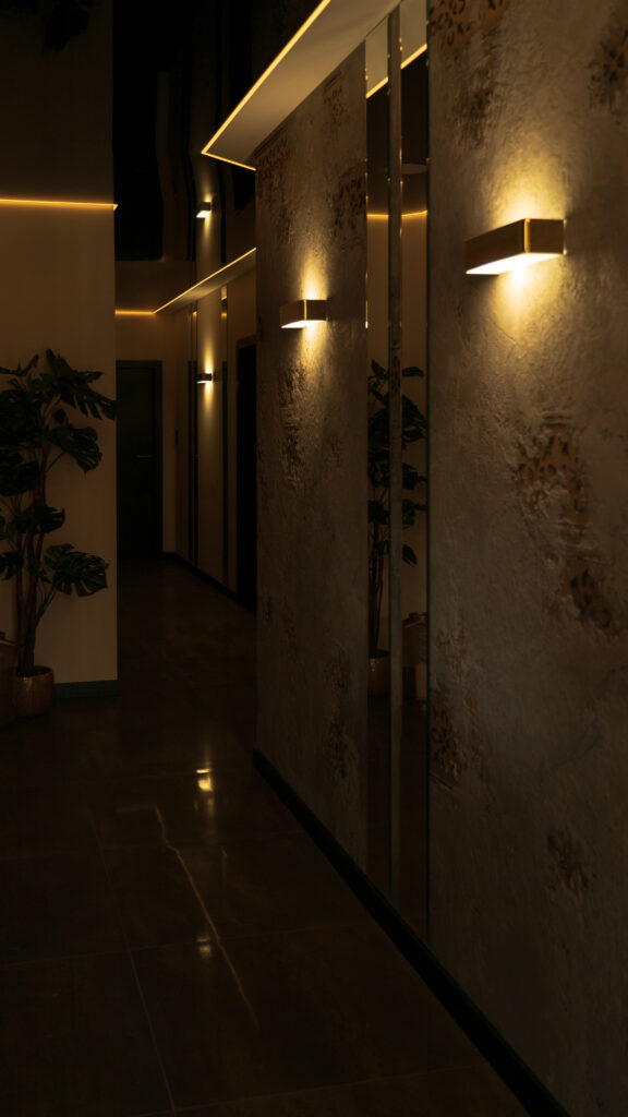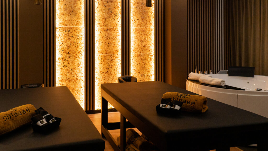 Salon masażu tajskiego SHIVAGO charakteryzuje się przytulnym i relaksującym wnętrzem, które nawiązuje do tradycyjnej estetyki tajskiej. Wnętrze zostało udekorowane w ciepłych kolorach, takich jak brązy, złoto, co tworzy atmosferę spokoju i harmonii. Charakteru dodaje betonowa ściana z ornamentem specjalnie przygotowanym dla marki Shivago. Całość podkreśla czerń, która jest nieodłącznym elementem w wyposażenia salonu. Przestrzeń wzbogaciliśmy o egzotyczne elementy, takie jak orientalne rzeźby, lampiony, świeczki i kadzidła, które dodają charakterystycznego tajskiego klimatu. Oświetlenie jest subtelne, co sprzyja relaksowi i wyciszeniu. Dzięki całość klienci mogą poczuć się odprężeni i zrelaksowani już w chwili przekroczenia progu salonu.
