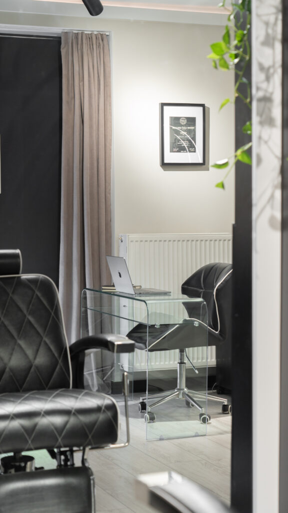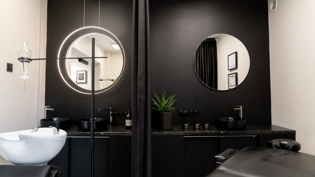 Salon zlokalizowany w samym sercu Żor. Analizując potrzeby klientki, staraliśmy stworzy miejsce, które będzie wyróżniać się nowoczesnym i eleganckim wnętrzem, które stwarza przyjemną atmosferę dla klientów. Wnętrze urządzono w stonowanej kolorystyce, dominują szarości, biele oraz naturalne drewno, co nadaje miejscu minimalistyczny i jednocześnie przytulny charakter.